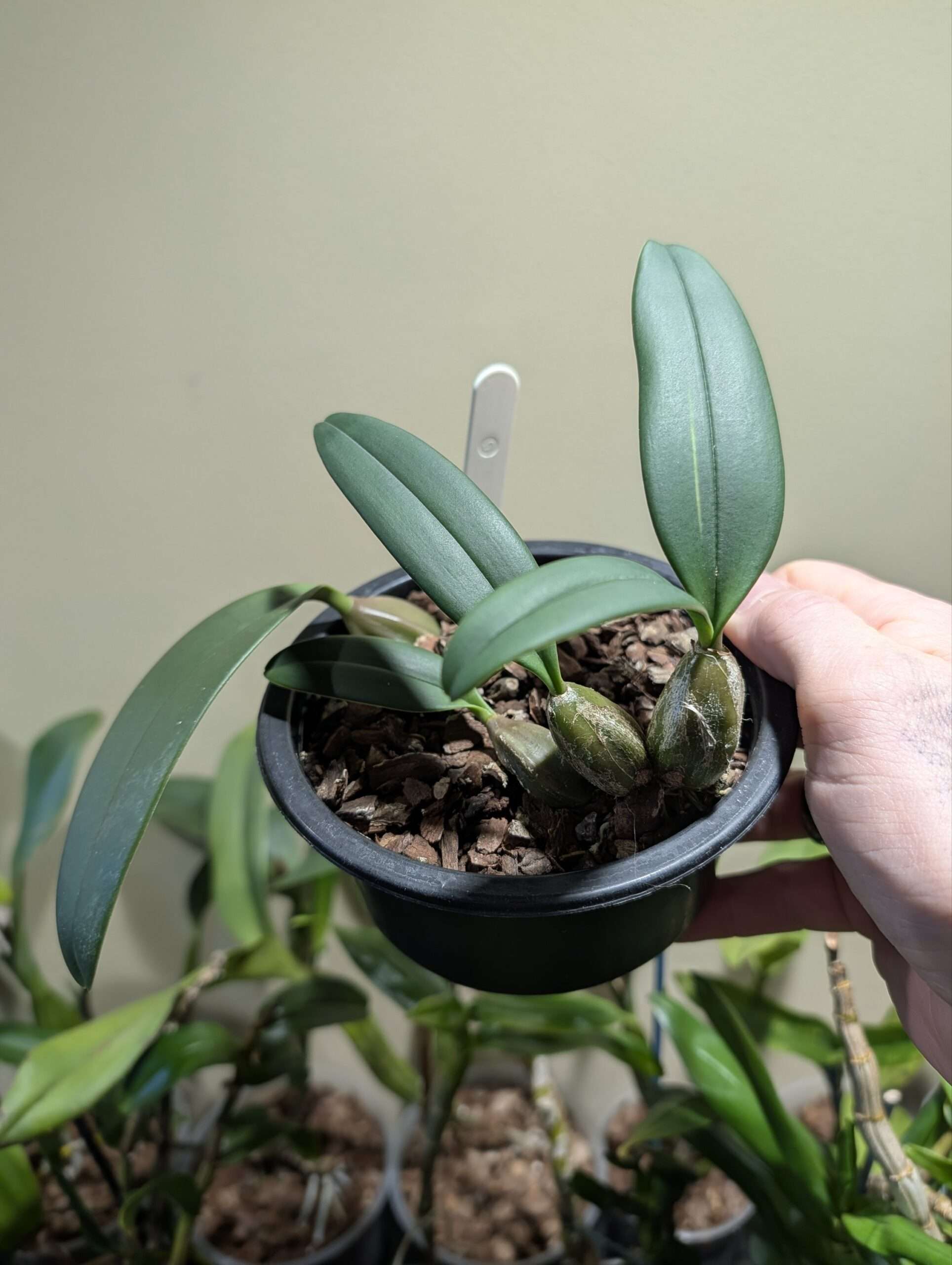 Plant Description: Medium sized egg shaped pseudobulbs with clinging shearhs on a rhizaromous plant, topped by a single stiff leaf.