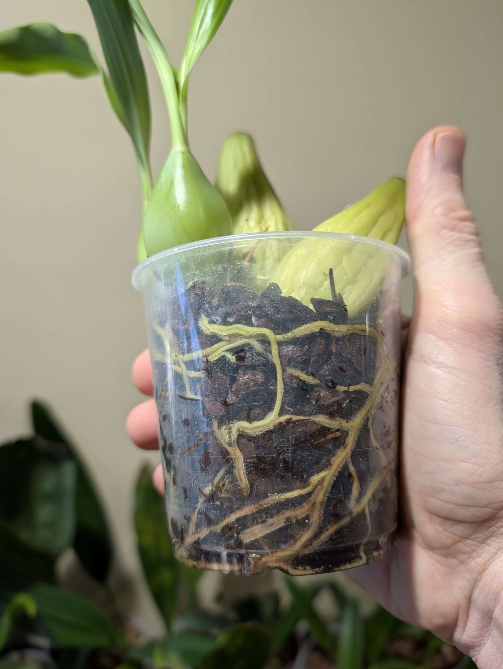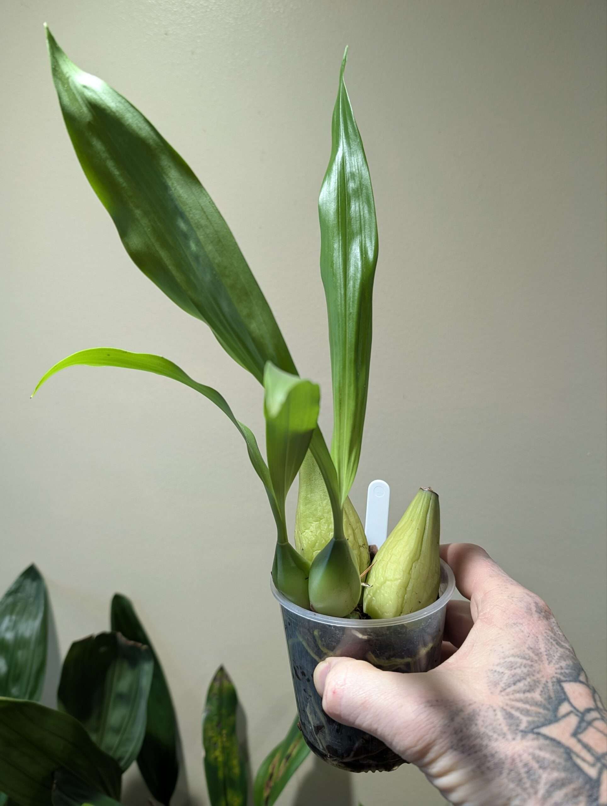 Description of plant: Clumping conical pseudobulbs topped by two tall leaves. Flowers produced on an upright inflorescence from new growth. Fast growing. This is a well established backbulb division.