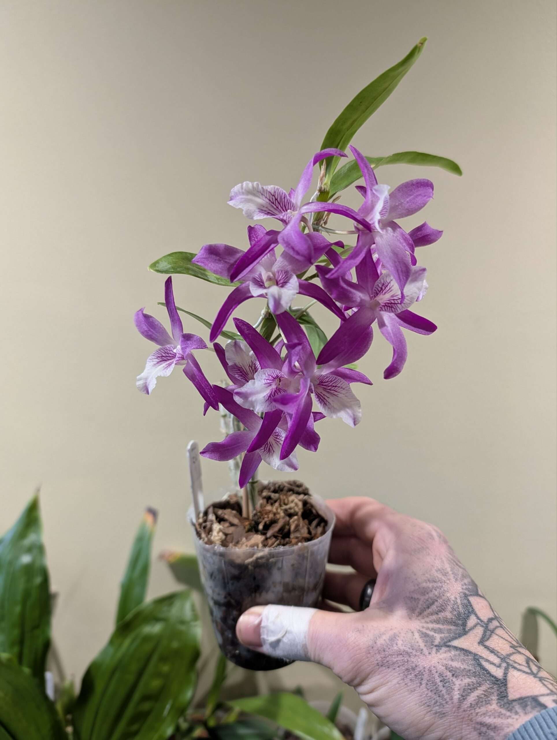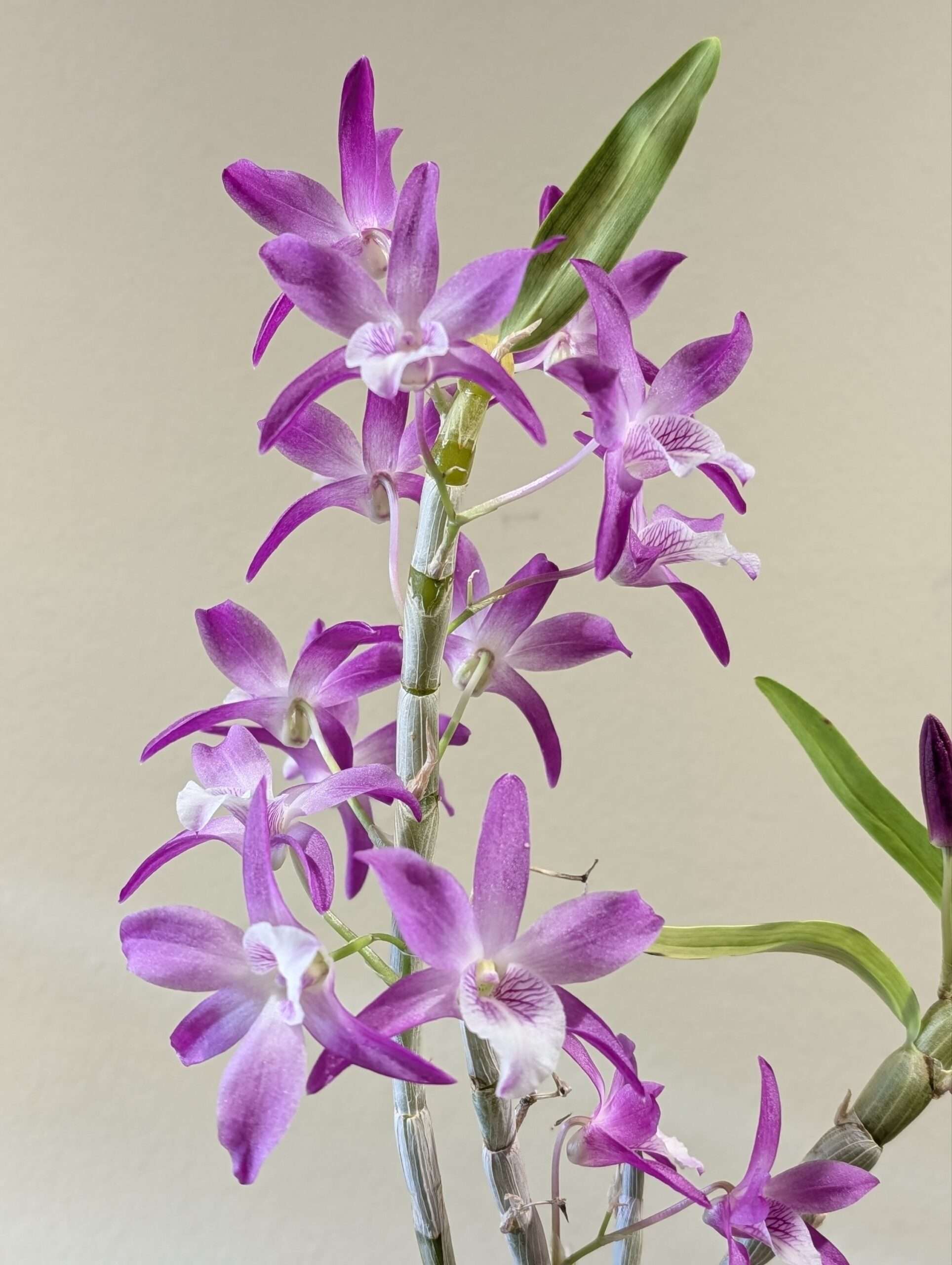 Plant Description: Nobile type hybrid with D. unicum in its background. Slim canes on a clumping plant, with thin semi deciduous leaves on the upper portions. Recently potted on.