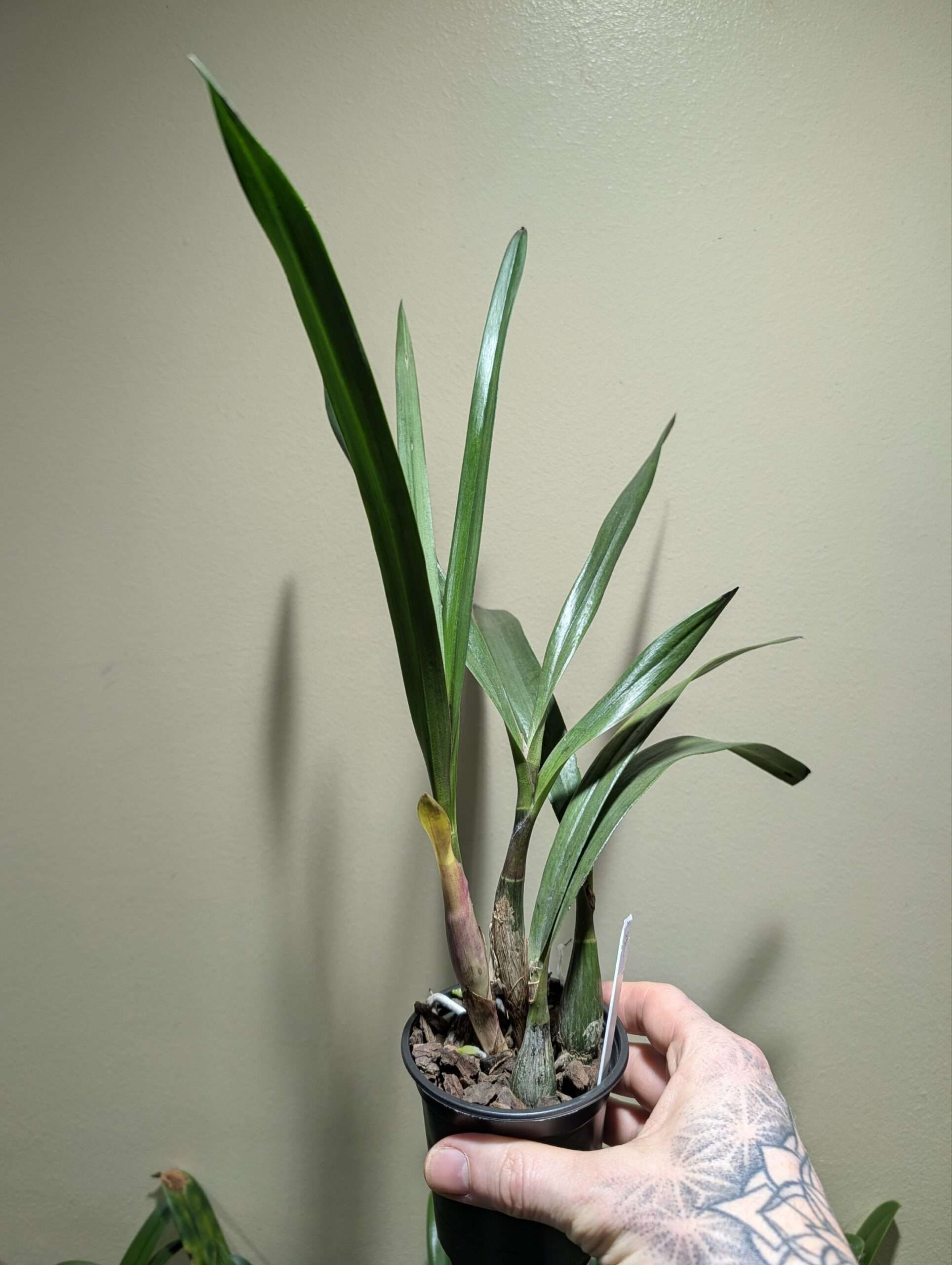 Plant description: stout cane like pseudobulbs with stiff strappy leaves. Halfway in appearance between an Encyclia and an Epidendrum as expected from this lovely intergenerics hybrid. Flowers produced from the tops of maturing pseudobulbs.